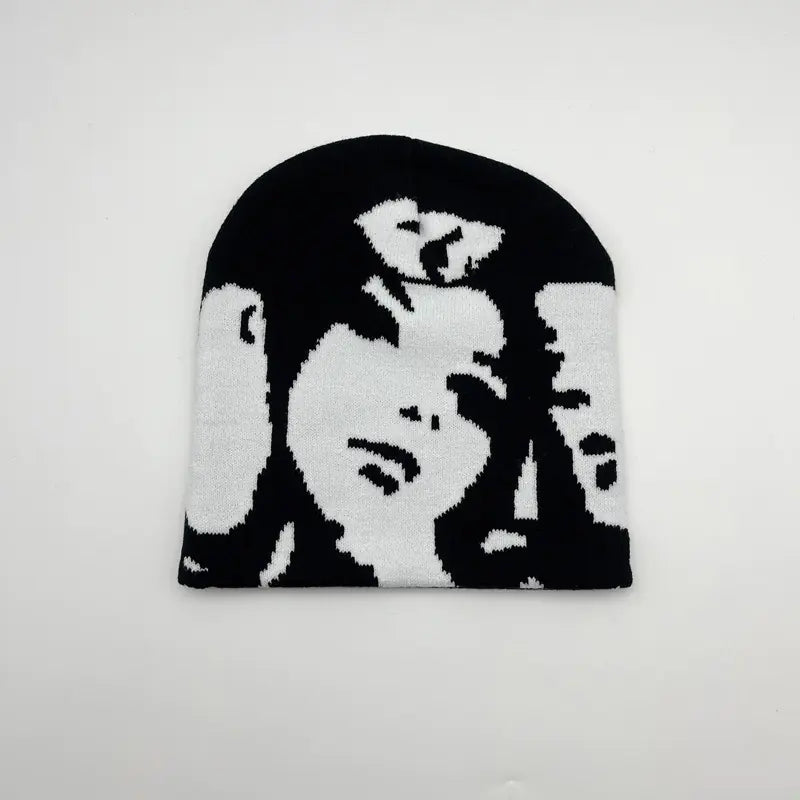 This stylish brimless knitted hat features European and American jacquard portraits. Crafted from breathable acrylic fabric, it is windproof and sunshades effectively, perfect for autumn and winter.