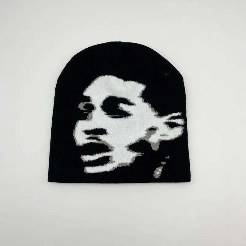This stylish brimless knitted hat features European and American jacquard portraits. Crafted from breathable acrylic fabric, it is windproof and sunshades effectively, perfect for autumn and winter.